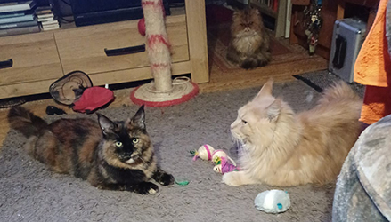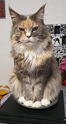 | Bella (Bild unten) ist recht schüchtern und will von ihrem Menschen erst erobert werden. Harry (Bild rechts) ist mit seinen fast 7,4 kg ein ganz gemütlicher Poly-Kater und großer Schmuser. Bella sucht oft seine Nähe und versteckt sich auch gern hinter ihm. |